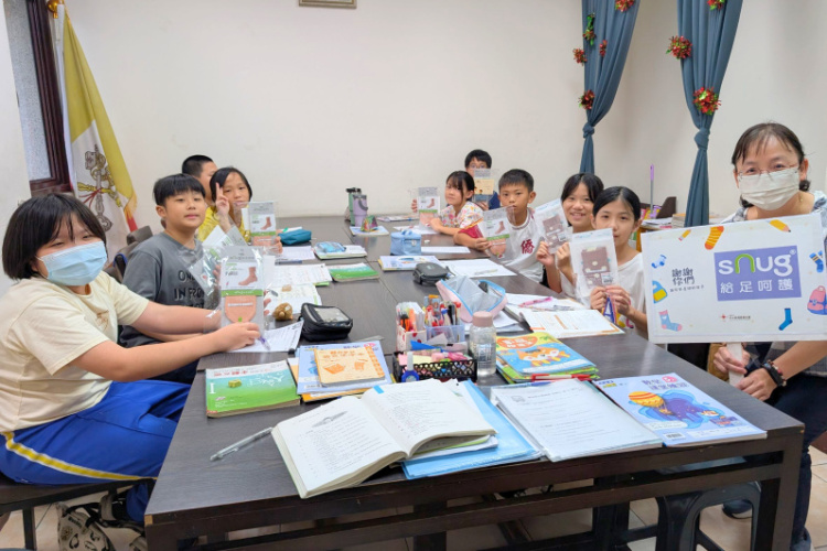 在開學的第一週,天主教博愛基金會團隊走訪了台中地區的三個兒童教育關懷站——霧峰、太平、南屯,親手將由 snug 精心挑選的開學襪,以及來自「好好聽自己」公益講座參與者所撰寫的「好聲音卡片」,送到孩子們的手中。