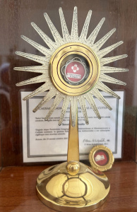 聖體小堂是平日彌撒所用之地,中懸方濟十字架,左側有聖德蘭姆姆聖髑,右側為耶穌的臨終「我渴」呼喚英文彩玻,在此敬體聖體,格外心定神凝,恩寵滿滿。